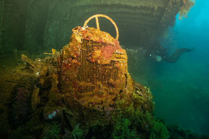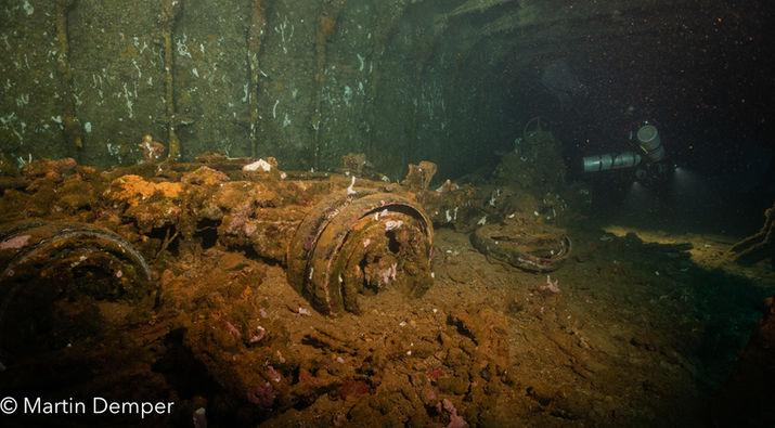 A medium sized freight vessel, of which's sinking remains a bit vague. She must have had a direct hit in the aft holds, or had raging fires which reached the ammunition stored in her after holds. There is not much left of the superstructure and aft holds, but the forward holds still hold a lot of interesting stuff to look at.